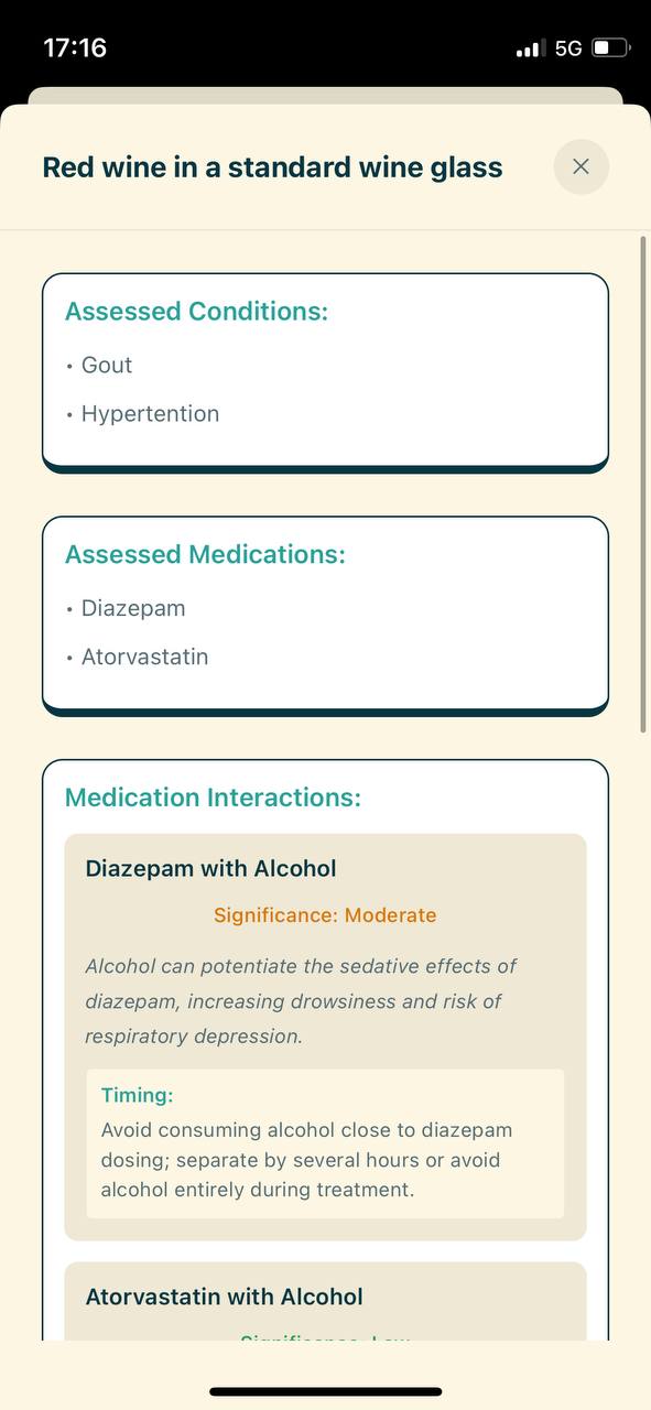 Instant analysis and risk scoring for food interactions with your medications and diagnosed health conditions.